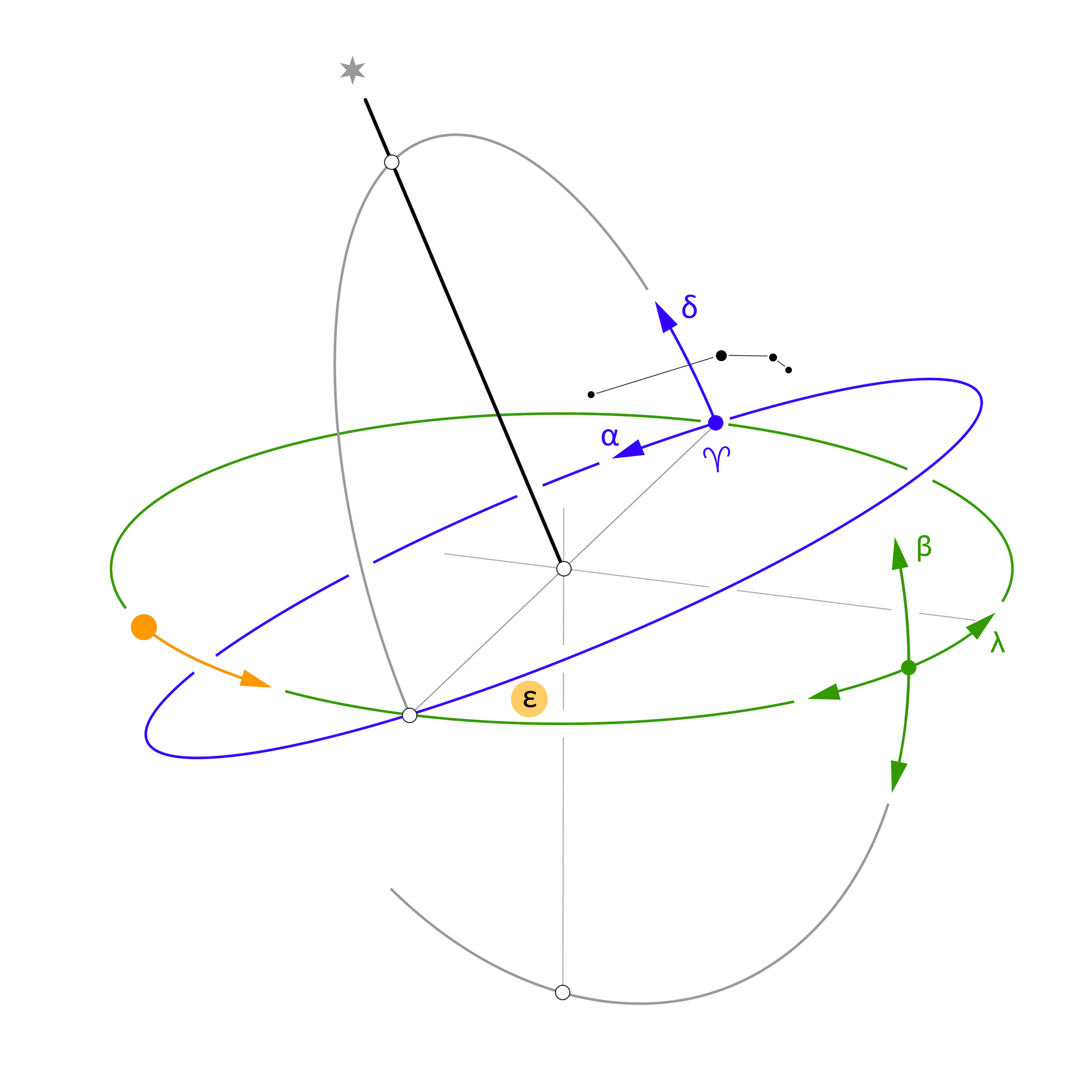 Koordinatenursprung ist der Widderpunkt im Sternbild Widder, hier auch eingezeichnet.